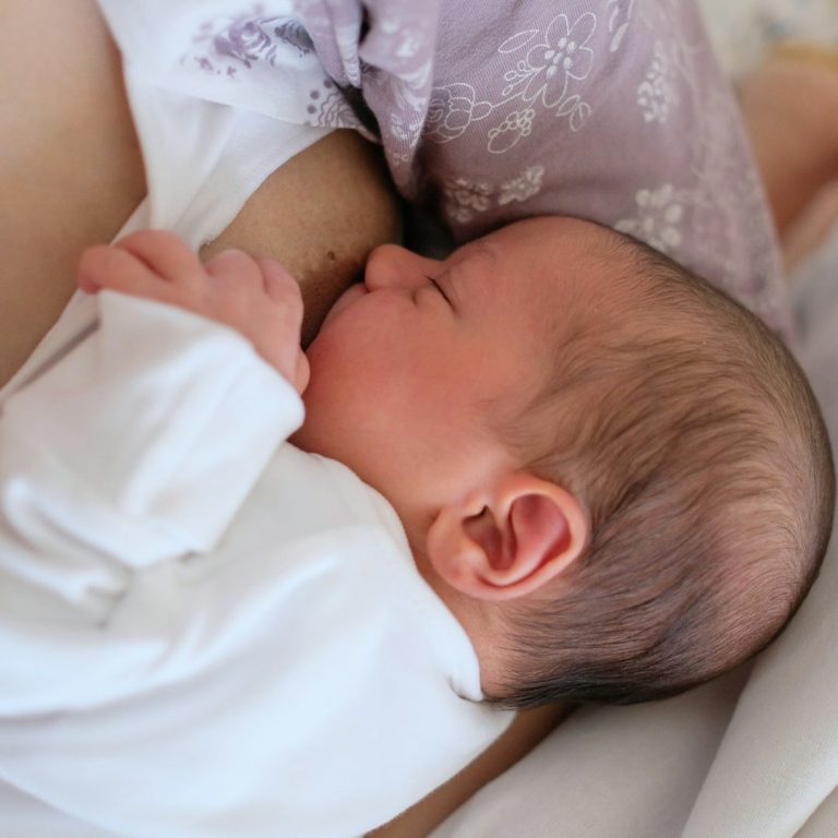 Wenn die Nase des Babys die Brust berührt oder leicht einsinkt hilft es, das Baby mit dem Po näher an den Körper der Mutter heranzuziehen. Dadurch legt sich der Kopf des Babys leicht in den Nacken und die Nase wird automatisch freier.