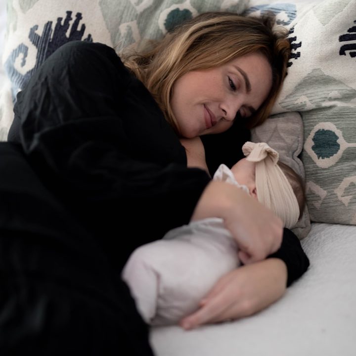 Das Stillen im Liegen ist vor allem in der Nacht eine große Entlastung. Mutter und Baby liegen dabei auf der Seite, Bauch an Bauch zueinander.